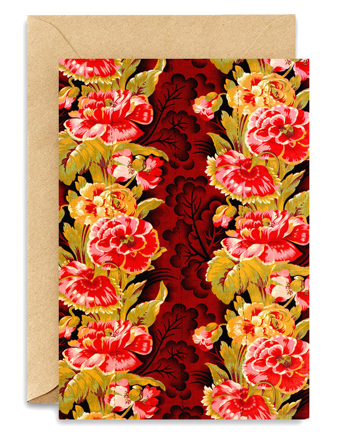 A gicleé fine art print in itself, this 5" x 7" greeting card doubles as a framable gift of a Russian textile print. Craft paper envelope, blank inside. Comes in a box set of 12 card-envelope sets, individually wrapped in acid-free cello bags. The box can be sold as a complete set in itself or broken up for display.