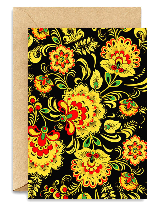 A gicleé fine art print in itself, this 5" x 7" greeting card doubles as a framable gift of a Russian textile print. Craft paper envelope, blank inside. Comes in a box set of 12 card-envelope sets, individually wrapped in acid-free cello bags. The box can be sold as a complete set in itself or broken up for display.