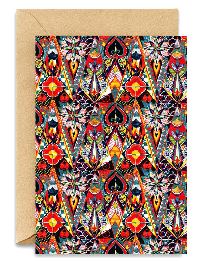 A gicleé fine art print in itself, this 5" x 7" greeting card doubles as a framable gift of a Russian textile print. Craft paper envelope, blank inside. Comes in a box set of 12 card-envelope sets, individually wrapped in acid-free cello bags. The box can be sold as a complete set in itself or broken up for display.
